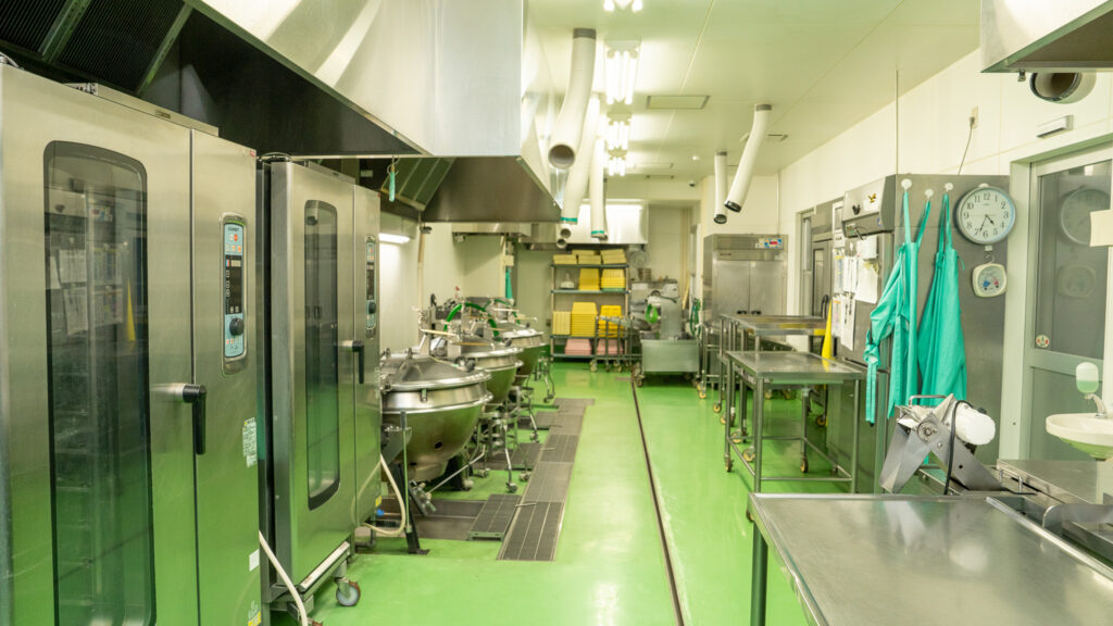 日々、決められた献立に沿って、大釜やスチームコンベクションなどの調理設備を使い、大量調理。